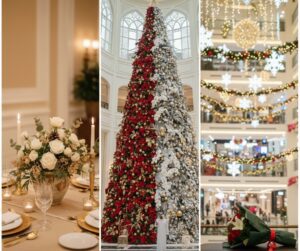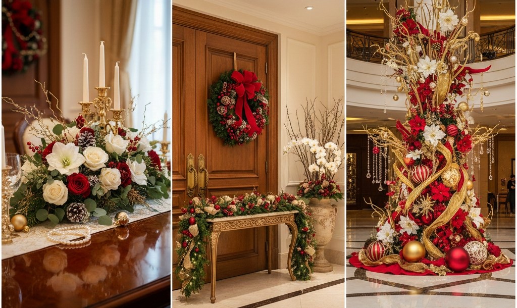 Both conventional red-and-green themes and milder winter palettes with white, gold, and natural greens inspire Christmas flower arrangement ideas throughout this international environment. Stylish table décor, elegant lobby installations, and well-thought-out entryway displays that showcase both local aesthetic tastes and the beauty of Christmas around the world are frequently found.