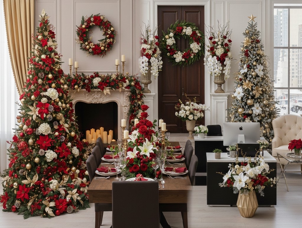 The goal of modern Christmas décor is to create a unified festive atmosphere in every area, and exquisitely chosen floral collections enable that. Elegant vases, side table arrangements, mantle displays, and seasonal highlights surrounding the Christmas flowers tree, where floral style naturally mixes with ornaments and gentle lighting, are some of the ways that Christmas flower decorations in homes provide warmth to living rooms, dining areas, and bedrooms.
