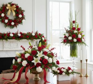 Fresh Christmas flowers, such as red roses, white lilies, and carnations, paired with winter foliage, pine accents, and seasonal berries, exquisitely display these colors, creating a visual language that feels both classic and opulent.