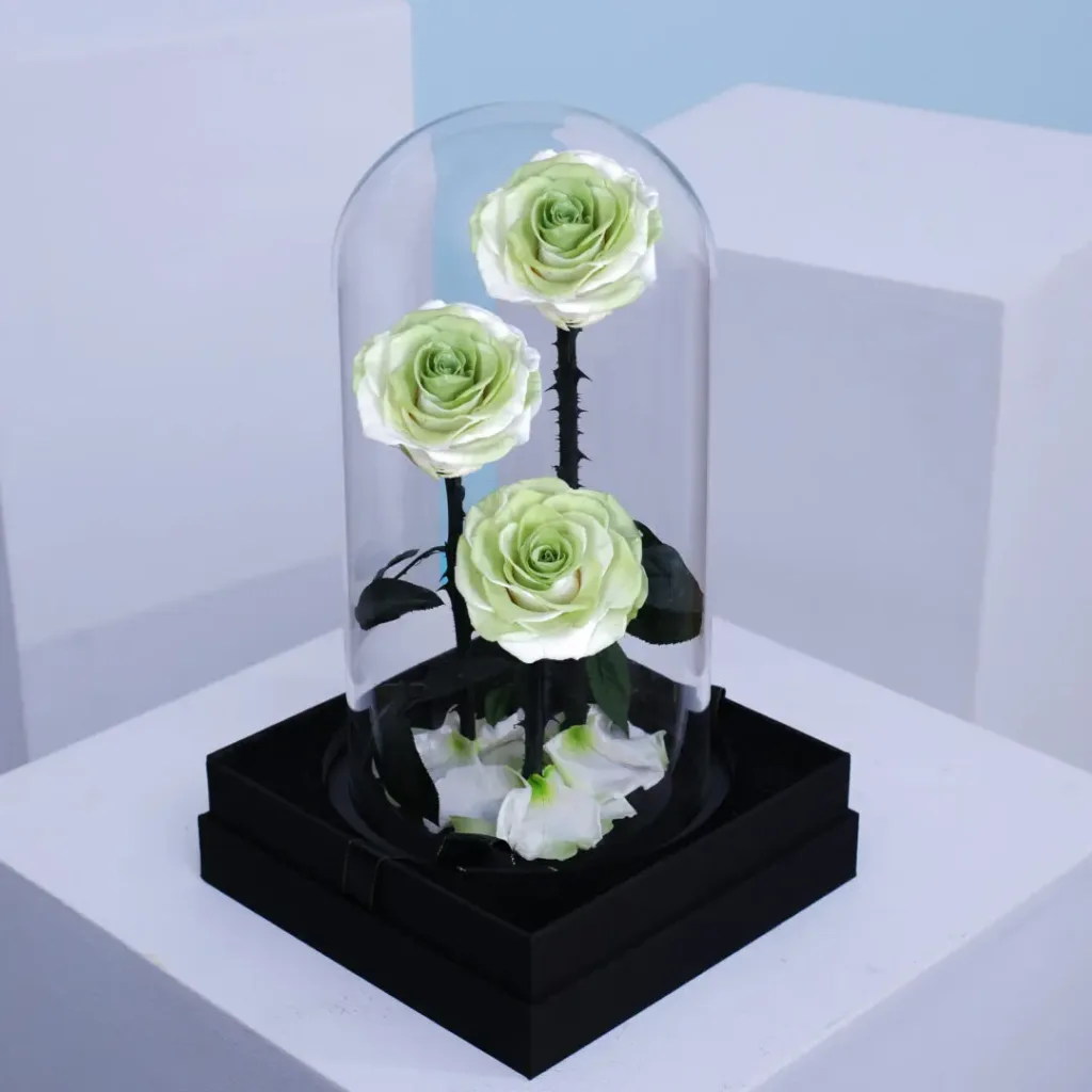 The rose dome is a high-end presentation of preserved roses contained within a glass dome. This presentation is ideal for creating a decorative look with added durability, making it an excellent choice for a home décor product or a luxury gifting experience.