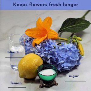Florists usually provide flower food with bouquets, but you can make your own at home. Mix a teaspoon of sugar (for nourishment), a few drops of bleach (to kill bacteria), and lemon juice (to lower pH and help water absorption).