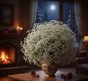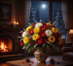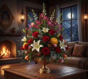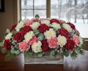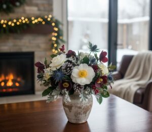 Cozy winter flower arrangements for the house emphasize warmth, texture, and relaxing color schemes. Soft-toned roses, creamy carnations, eucalyptus, pine, and baby’s breath create welcoming winter flower displays that are both cozy and fresh.