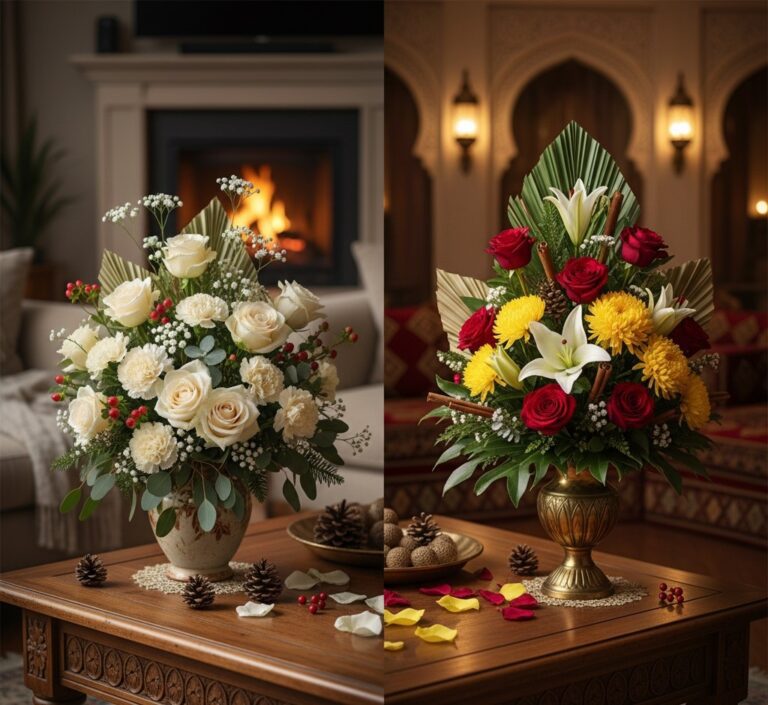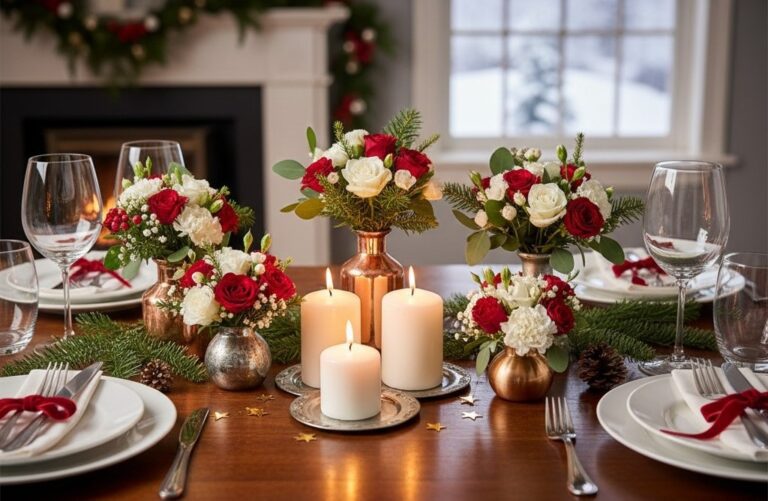 Mini winter flower bouquets, fragrant candles, pine sprigs, and metallic embellishments transform everyday tables into festive displays. Choosing winter flowers that bloom during this time provides freshness and longevity, while a combination of red, white, and green blooms complements the festive palette perfectly.