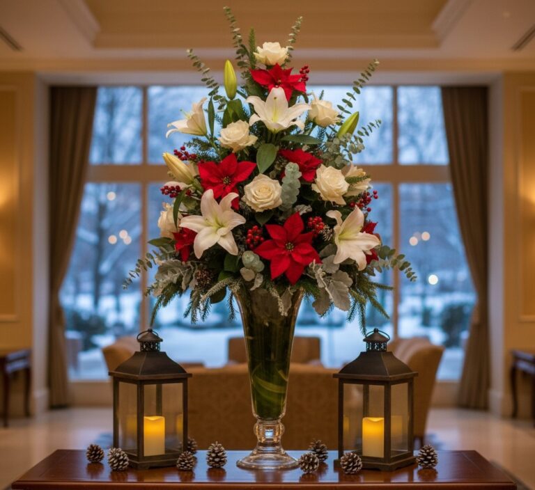 Tall vase filled with lilies, eucalyptus, poinsettias, and mixed winter flowers make any entrance feel welcoming. Such floral centrepieces serve as the first impression for guests in homes, offices, or hotel lobbies, perfectly blending elegance with festive charm. Incorporating greenery and winter decorations, such as pinecones or lanterns, enhances the seasonal vibe.