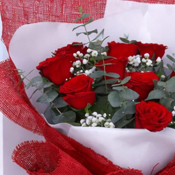 Bunch Of 10 Red Roses: Bunch of 10 Stems of Red Roses with Eucalyptus Leaf tied with Raffia wrapped in a red and white color. Surprise your loved one with our 10 Red Roses Delivery! This classic bouquet symbolizes love and admiration, perfect for expressing your heartfelt emotions. Order now for a thoughtful gift that will make their day even more special!