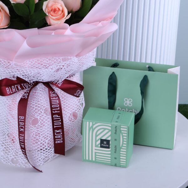 Celebrate special moments with our Peach Rose Bouquet and ruscus leaves wrapped in delicate pink paper, paired with patchi chocolate box. Perfect for birthdays, anniversaries, or heartfelt surprises.