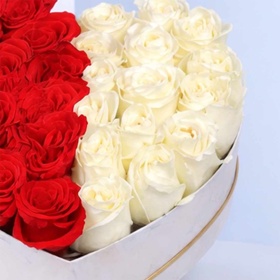 A heart shape rose box for your loved one, a gesture of your gratitude, a token of your appreciation or just a way to say how much you care! Send the most beautiful Red and White Roses box bouquet and be assured that they will be touched by it.